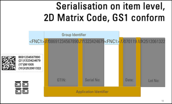Codes, meist ein 2D-Datamatrixcode, enthält Informationen über das Medikament, (z.B.